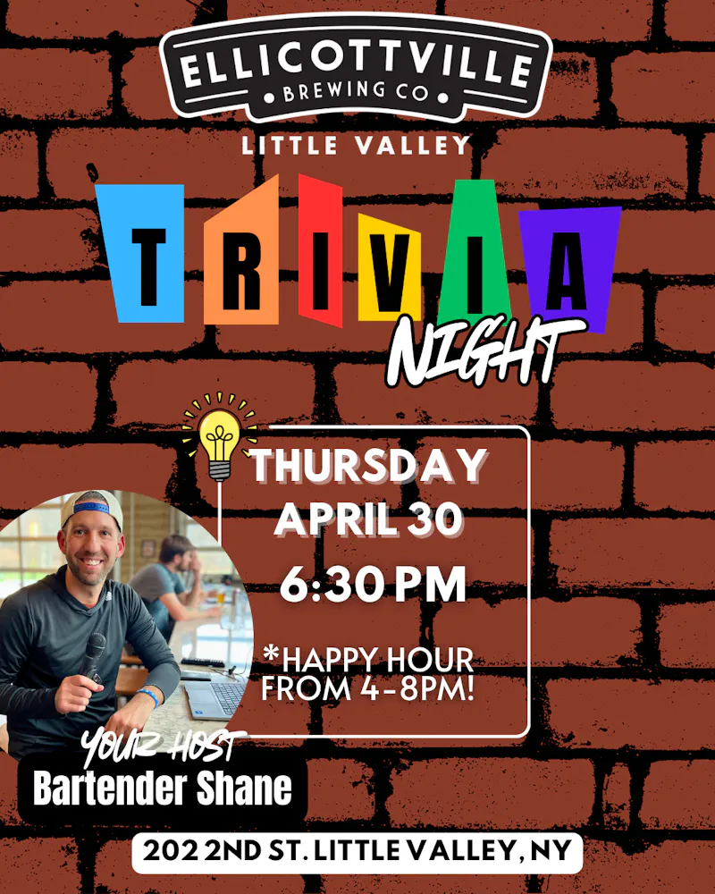 Test your knowledge with a fun-filled evening of trivia on Thursday, April 30th at 6:30pm, with your host, Bartender Shane!